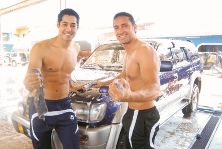 Los modelos “Chichito” Padilla y Marco Rodríguez, en su afán de ganar votos vía sms y quedar como favoritos en el programa “Baile de estrellas”, decidieron lavar autos a mitad de precio y por diez mensajes que manden a su favor. El programa se emite en la red Uno de televisión.